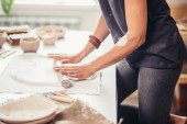 Kobieta co ceramiki i ceramiki naczynia na warsztatach, pracy z gliny z bliska