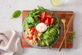 Zdjęcie "Quinoa miska z awokado, ogórek, jajko, soczewicy. Wegetariańska zdrowy obiad" może być wykorzystywane do celów osobistych i komercyjnych zgodnie z warunkami zakupionej licencji Royalty-free. Obraz jest dostępny do pobrania w jakości wysokiej rozdzielczości do 5760x3840.