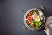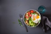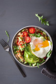 Quinoa miska z awokado, ogórek, jajko, soczewicy. Wegetariańska zdrowy obiad