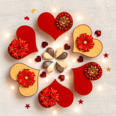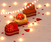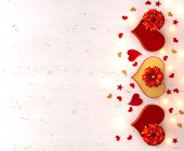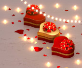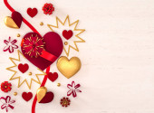 renderowania 3D. Skład rysunek pomiarowej genialny serca, czerwony, złoto, Walentynki lub ślub dzień tematów romantyczny dla firm, imprez, pudełko w kształcie serca, prezent. Świecące girlandy, żarówki, oświetlenie.
