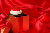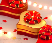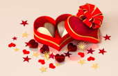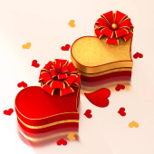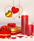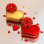 renderowania 3D. Skład rysunek pomiarowej genialny serca, czerwony, złoto, Walentynki lub ślub dzień tematów romantyczny dla firm, imprezy. Pudełko w kształcie serca czerwone, prezent. Świecące girlandy, żarówki, oświetlenie.
