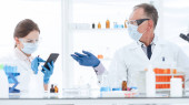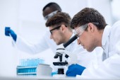 z bliska samiec naukowiec używa mikroskopu w laboratorium