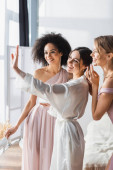 Selektywny fokus piękne wielokulturowe dziewczyny ze snem maski obchodzi z szampanem w domu podczas piżamy strona