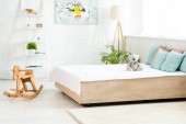 nowoczesny design wnętrza sypialni z zabawkami Miś, poduszki, rośliny i łóżko