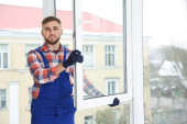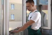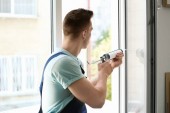 Pracownik budowlany przy użyciu poziomnicę podczas instalacji okno w pomieszczeniu, zbliżenie