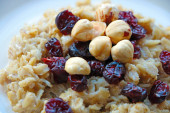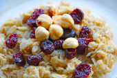 Quinoa owsianka z orzechami, pomarańczowy i granatu nasion jako tło, zbliżenie