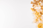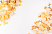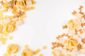 Napowietrznych zdjęcie różnego rodzaju makarony, spaghetti, penne, fusilli i innych, w tym łupić lay na białym tle z miejscem na tekst