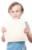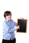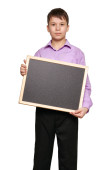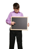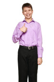 Chłopiec, pozowanie na białe tło, czarne spodnie i fioletowy koszula