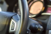 Wnętrza samochodów luksusowych. Deska rozdzielcza i kierownica w czarny kolor szary. Transport, design, koncepcja nowoczesnych technologii.