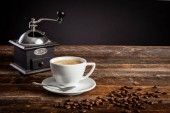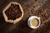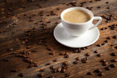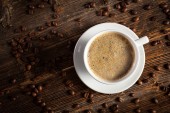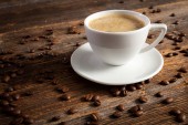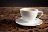 Biały filiżankę kawy i kilka ziaren kawy na stojący na zabytkowy drewniany stolik