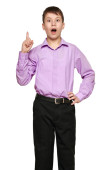 Chłopiec, pozowanie na białe tło, czarne spodnie i fioletowy koszula