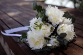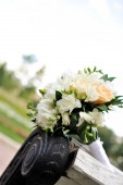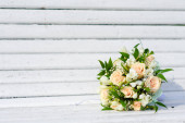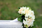 Bukiet panny młodej na ławce biały. Piękny ślub bukiet.