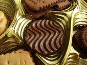 Różnorodność czekoladowych Bonbonów w pudełku ze złotymi czekoladą
