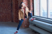 smutna dziewczyna sam siedzi przy oknie. Kurtka zimowa, Moda uliczna dla nastolatków.