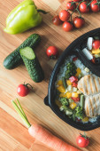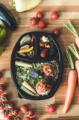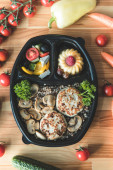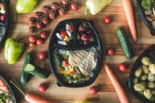 Kolekcja zabrać folia pola ze zdrową żywnością. Zestaw pojemników z codziennych posiłków - mięso, warzywa i prawa tłuszczu przekąski na białym tle, widok z góry