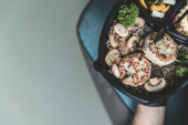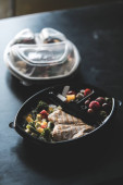 Kolekcja zabrać folia pola ze zdrową żywnością. Zestaw pojemników z codziennych posiłków - mięso, warzywa i prawa tłuszczu przekąski na białym tle, widok z góry