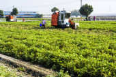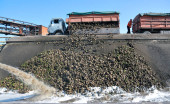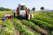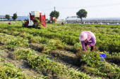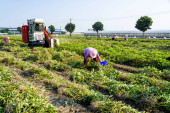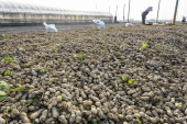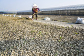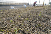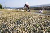 Rolnik rozsypuje świeże orzeszki ziemne na ziemię do wyschnięcia