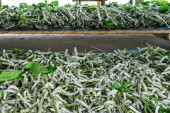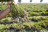 Rolnik rozsypuje świeże orzeszki ziemne na ziemię do wyschnięcia