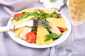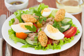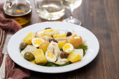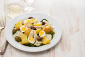 Zdjęcie "Sałatka na białe płytki i białe wino" może być wykorzystywane do celów osobistych i komercyjnych zgodnie z warunkami zakupionej licencji Royalty-free. Obraz jest dostępny do pobrania w jakości wysokiej rozdzielczości do 5760x3840.