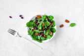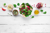 Zdjęcie "Zdrowa Sałatka składniki do gotowania zdrowe wegańskie Sałatka - liście szpinaku baby, apple, orzechy pekan, suche żurawiny. Czyste, jedzenie lub diety składniki żywności na białym tle, miejsce." może być wykorzystywane do celów osobistych i komercyjnych zgodnie z warunkami zakupionej licencji Royalty-free. Obraz jest dostępny do pobrania w jakości wysokiej rozdzielczości do 5760x3840.