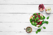 Zdrowa Sałatka składniki do gotowania zdrowe wegańskie Sałatka - liście szpinaku baby, apple, orzechy pekan, suche żurawiny. Czyste, jedzenie lub diety składniki żywności na białym tle, miejsce.