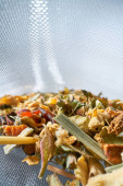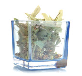 suszone zioła w szklanych pojemnikach na drewniany stół szczegół