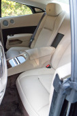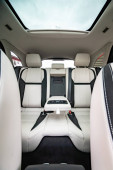 Tylne siedzenia pasażera w nowoczesnym luksusowym samochodzie, widok z przodu, biała skóra
