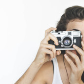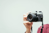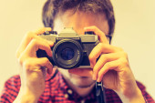Młody mężczyzna w kraciastej koszuli czerwono niebieskie jest fotografowanie aparatem vintage, retro styl