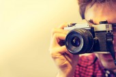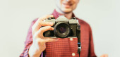 Zdjęcie "Młody mężczyzna w kraciastej koszuli czerwono niebieskie jest fotografowanie aparatem vintage, retro styl" może być wykorzystywane do celów osobistych i komercyjnych zgodnie z warunkami zakupionej licencji Royalty-free. Obraz jest dostępny do pobrania w jakości wysokiej rozdzielczości do 5760x3840.
