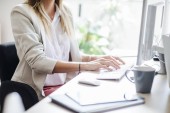Młoda kobieta interesu pracę na komputerze stacjonarnym za pomocą myszy i klawiatury w nowoczesnej powierzchni biurowej.