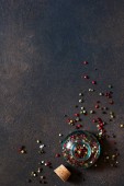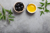 Zbliżenie z tradycyjnych składników potraw: czosnek, oliwa z oliwek, sól, pieprz, świeże zioła na ciemnym tle rustykalnym. Rama żywności, koncepcja do gotowania zdrowej żywności z miejsca dla tekstu, widok z góry