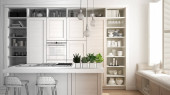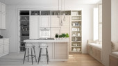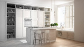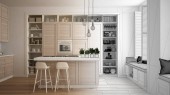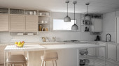 Zdjęcie "Architekt wnętrz Projektant koncepcji: niedokończony projekt, który staje się prawdziwym, kuchnia z drewnianymi elementami w nowoczesnych apartamentów z parkietu, minimalistyczny design pomysł" może być wykorzystywane do celów osobistych i komercyjnych zgodnie z warunkami zakupionej licencji Royalty-free. Obraz jest dostępny do pobrania w jakości wysokiej rozdzielczości do 5760x3840.
