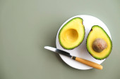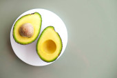 Zdjęcie "Biały marmur coaster z o połowę składników odżywczych gęsty owoców awokado plasterki pełne serce zdrowe jednonienasyconych na szary szklany blat stołu. Bliska, skopiuj przestrzeń, widok z góry, tło." może być wykorzystywane do celów osobistych i komercyjnych zgodnie z warunkami zakupionej licencji Royalty-free. Obraz jest dostępny do pobrania w jakości wysokiej rozdzielczości do 5760x3840.
