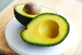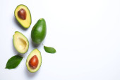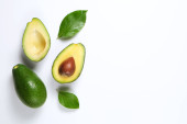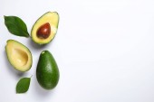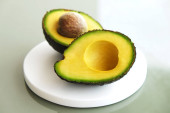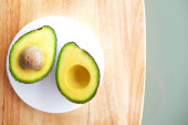 Biały marmur coaster z o połowę składników odżywczych gęsty owoców awokado plasterki pełne serce zdrowe jednonienasyconych na szary szklany blat stołu. Bliska, skopiuj przestrzeń, widok z góry, tło.