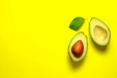 Zdjęcie "Minimalny skład z całą i połowę składników odżywczych gęsty owoców awokado plasterki pełne serce zdrowe jednonienasyconych na szary szklanego blatu. Bliska, skopiuj przestrzeń, widok z góry, tło." może być wykorzystywane do celów osobistych i komercyjnych zgodnie z warunkami zakupionej licencji Royalty-free. Obraz jest dostępny do pobrania w jakości wysokiej rozdzielczości do 5760x3840.