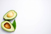 Minimalny skład z całą i połowę składników odżywczych gęsty owoców awokado plasterki pełne serce zdrowe jednonienasyconych na szary szklanego blatu. Bliska, skopiuj przestrzeń, widok z góry, tło.