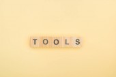 Widok z góry z witamina napis wykonany z drewnianych kostek na żółtym tle