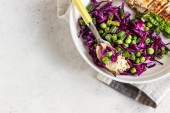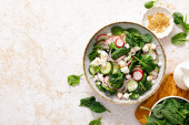 Zdjęcie "Szpinak i rzodkiewka sałatka z sosem z masła orzechowego. Jasnoszarym tle betonowych. Kopiować miejsca. Żywność wegetariańska zdrowy. " może być wykorzystywane do celów osobistych i komercyjnych zgodnie z warunkami zakupionej licencji Royalty-free. Obraz jest dostępny do pobrania w jakości wysokiej rozdzielczości do 5760x3840.