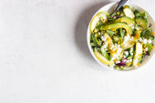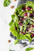 Zdjęcie "Szpinak i rzodkiewka sałatka z sosem z masła orzechowego. Jasnoszarym tle betonowych. Kopiować miejsca. Żywność wegetariańska zdrowy. " może być wykorzystywane do celów osobistych i komercyjnych zgodnie z warunkami zakupionej licencji Royalty-free. Obraz jest dostępny do pobrania w jakości wysokiej rozdzielczości do 5760x3840.