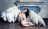 Anioł sexy dziewczyna ze skrzydłami puszyste pióro. Lady sexi ubrana jak Anioł, czerwonym tle. Sexy Anioł koncepcja. Kobieta na twarz zamyślony zagrać rolę. Dziewczyna w Body wygląda szczupły, przetargu, czysty, miejsce