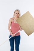 Blond dziewczyna ubrana w eko Odzież stojący w pobliżu polietylenu i przytrzymując drewniany znak z przejść zielony napis na beżowym tle, koncepcja zapisywanie środowiska