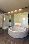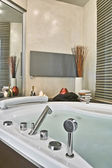 Czyste łazienki nowoczesne wanna, łazienka biały higiena nowoczesnego stylu. Hotel real estate, luksusowe samopoczucie styl wypoczynek i opieki. luksusowe jacuzzi wanną. Łazienka z jacuzzi w nowoczesny hotel.
