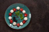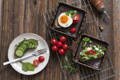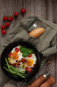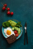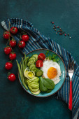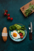 Jajko sadzone ze świeżych warzyw i chleb na beton zielone tło. Widok z góry, wewnętrzny, flatlay