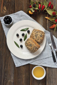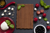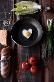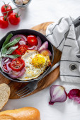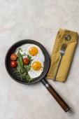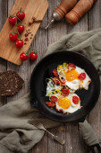 Pan smażone jajka i pomidory cherry na tle rustykalnym. Widok z góry, wewnętrzny, flatlay