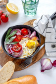 Zdjęcie "Pan smażone jajka i pomidory cherry na tle rustykalnym. Widok z góry, wewnętrzny, flatlay" może być wykorzystywane do celów osobistych i komercyjnych zgodnie z warunkami zakupionej licencji Royalty-free. Obraz jest dostępny do pobrania w jakości wysokiej rozdzielczości do 5760x3840.