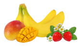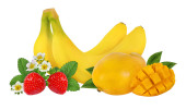 Ananas, banan, truskawka, kiwi i mango na białym tle na białym tle ze ścieżką przycinającą