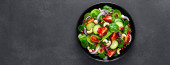 Szpinaku Sałatka ze świeżych ogórków, pomidor, cebula, granat, sezamem i orzechy nerkowca na czarnym tle. Zdrowe posiłki wegańskie jedzenie. Widok z góry
