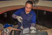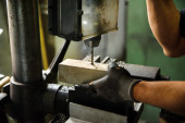 Zajęty i poważne czarnoziem szlifowania drewna z maszyny specjalne.