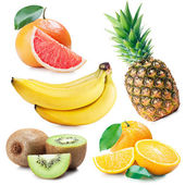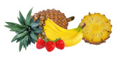 Ananas, banan, kiwi, truskawka i mango na białym tle na białym tle ze ścieżką przycinającą