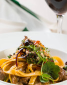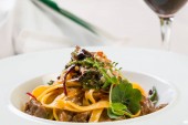 włoskie spaghetti amatriciana makaron na białym talerzu